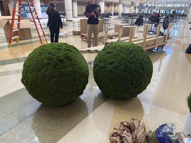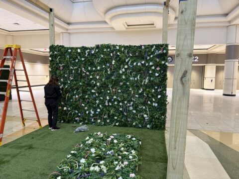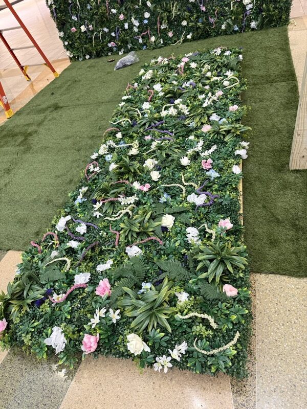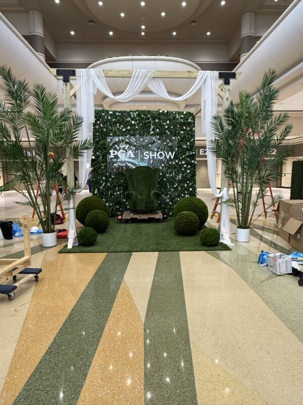 - Components: Preserved green wall, sculpted topiary, turf chair, faux palms, drapery, lighting accents
