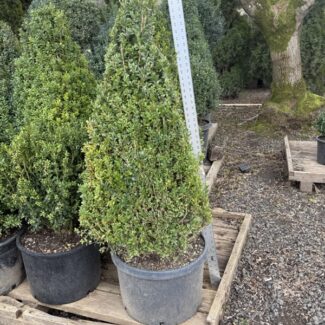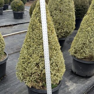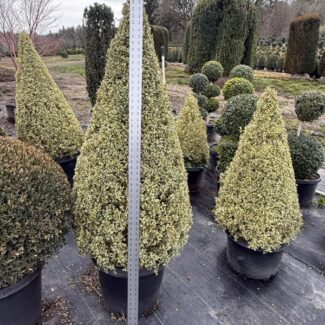 Introduce striking height and sculptural elegance to your landscape with our 31-34-inch-tall live Boxwood Cone. Expertly grown and meticulously shaped, this towering cone delivers a bold architectural presence while maintaining the lush, dense foliage for which boxwood is known. Its impressive size makes it ideal for framing entryways, enhancing patios, or creating dramatic symmetry in formal garden designs.