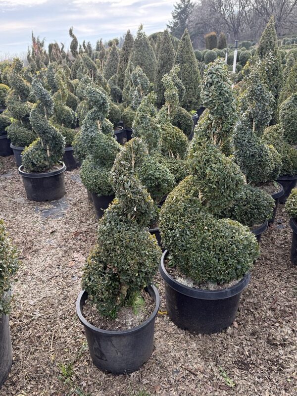 Bring movement, height, and sculptural elegance to your landscape with a live boxwood spiral topiary. Expertly cultivated and hand‑shaped, each spiral features dense evergreen foliage trained into a graceful, twisting form that adds instant architectural interest to any outdoor garden. The flowing spiral design creates a sense of motion and sophistication, making it a standout focal point for patios, entryways, walkways, and formal garden layouts.