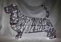 This frame topiary of a basset hound is made of hand-crafted and powder-coated wire of several different sizes. The wires outline such details as the eyes and nose. Since all topiaries are constructed by hand, the given sizes are approximations, and each topiary may differ slightly.Â