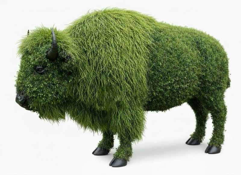 - Galvanized with green boxwoods, eye/nose/horn/hooves details, and artificial grass around the front section of the bison and tail